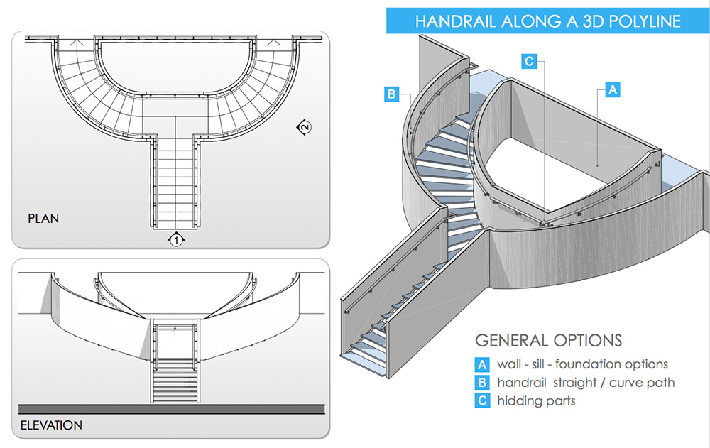 3DMD Railings are archicad object tools. You can simple draw a 3d polyline both 2d and 3d window. You can create curved and sloped path. There are many parameters for post, panel, cable, handrail; you can create you own rail. An option for list allow you to have the railing straightened in the schedule also with quantities for each elements of the railing. You can quickly manage in 2d/3d windows the position and visibility of posts and cables/panels.