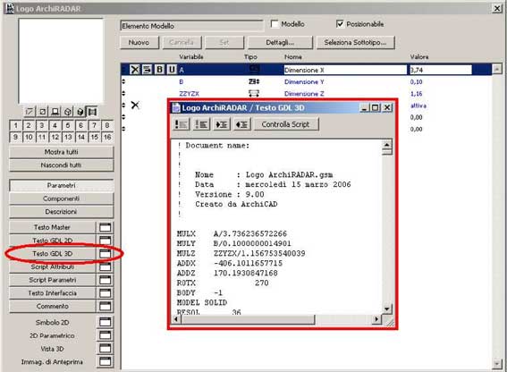 Adesso clicchiamo sulla finestra bianca accanto il tasto“Testo GDL 3D” che ci farà apparire la finestra con le righe di comando.
