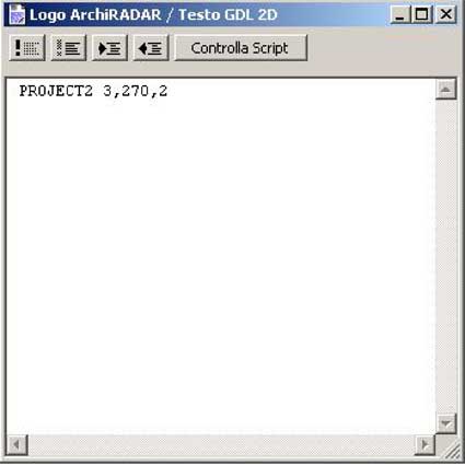 Chiudiamo la finestra e del “Testo GDL 3D” e clicchiamo sulla finestra bianca accanto il tasto “Testo GDL 2D” e scriviamo all’interno della finestra bianca il seguente comando: “PROJECT2 3,270,2”