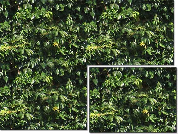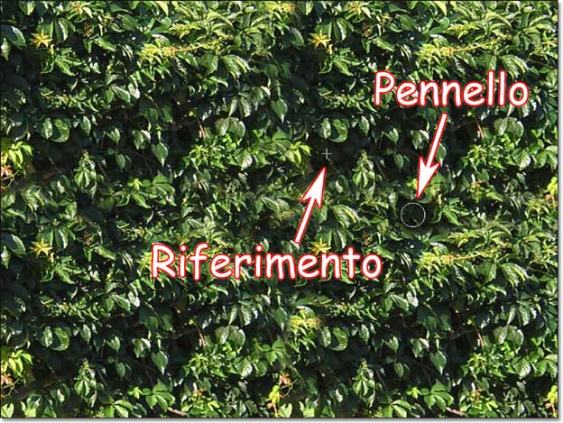 Mentre procedete con questa operazione vedrete sparire le foglie spezzate, a cavallo della giuntura, sostituite da altre intere, “clonate” da un’altra area della stessa immagine. Anche queste, in realtà non vengono prese in modo selettivo, e probabilmente non saranno intere, ma le discontinuità saranno sfumate e in posizioni irregolari, diventando difficilmente percettibili. Non occorre arrivare fino ai bordi, infatti useremo solo la parte centrale.