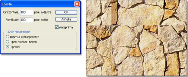 Invece di moltiplicare l’originale, per evidenziare le giunture, questa volta userò il comando Muovi (Filtri/Altro/Muovi), che sposta l’immagine, mandando “a capo” la parte che si fa uscire da uno dei lati (deve essere attiva l’opzione “Riprendi”).