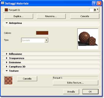 Per creare un materiale nuovo è sufficiente sceglierne uno qualsiasi dal menu a comparsa in alto (meglio se simile a quello che desideriamo) e cliccare sul pulsante Duplica. Le varie sezioni del dialogo permettono di intervenire su tutti i parametri e, nell’ultima, si trovano i pulsanti che permettono di associare (o eliminare) la texture. Cliccando sul pulsante Edita Texture si aprirà una finestra di impostazione.