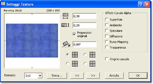In precedenza avevamo attribuito la dimensione fisica all’immagine (300 pixel per 200), ora occorre assegnare la dimensione logica alla texture, ovvero la misura effettiva di ciò che rappresenta. Sapendo che le piastrelle hanno il lato di dieci centimetri, le misure da inserire nei primi due campi sono 0,30 e 0,20. L’area di esempio, a sinistra, mostra un’anteprima della texture, per valutare anche l’effetto dell’accostamento. Il menu a comparsa in basso permette di vedere l’immagine da sola, o di accostarne fino a 4x4. Ricordate comunque che le misure indicate si riferiscono sempre alla singola immagine.