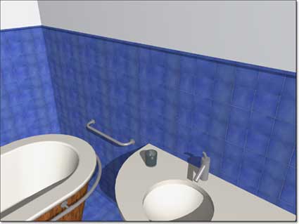 Dopo aver chiuso le finestre con OK, il materiale sarà disponibile per essere assegnato agli elementi di costruzione. Nel piccolo esempio qui sotto, ho mes-so, uno sull’altro, un muro con il materiale appena creato, alto un metro e mezzo, uno simile, alto due centimetri, leggermente sporgente, per creare il bordo superiore, ed infine uno bianco. Lo stesso materiale è assegnato anche alla superficie superiore del solaio, per formare il pavimento.