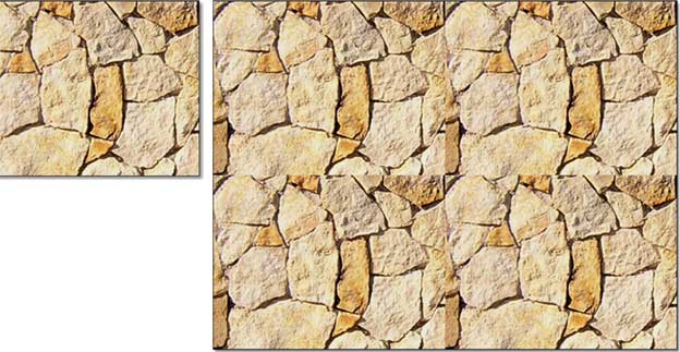 Questo che abbiamo visto, cioè il caso delle piastrelle quadrate o rettangolari, è senz’altro il più semplice, ma non il più comune. Quando l’elemento rappresentato nella texture non è così regolare, sorge un nuovo problema: non c’è una linea orizzontale o verticale su cui tagliare l’immagine, per fare in modo che le ripetizioni non presentino discontinuità.