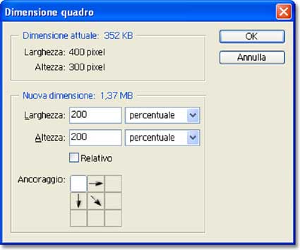 Seleziono l’intera immagine (Ctrl-A su Windows o Comando-A su OSX) e la copio (Ctrl-C o Comando-C su Mac). Poi raddoppio l’area di lavoro (Immagine/Dimensione quadro), rispetto alle dimensioni correnti (400x300 pixel).