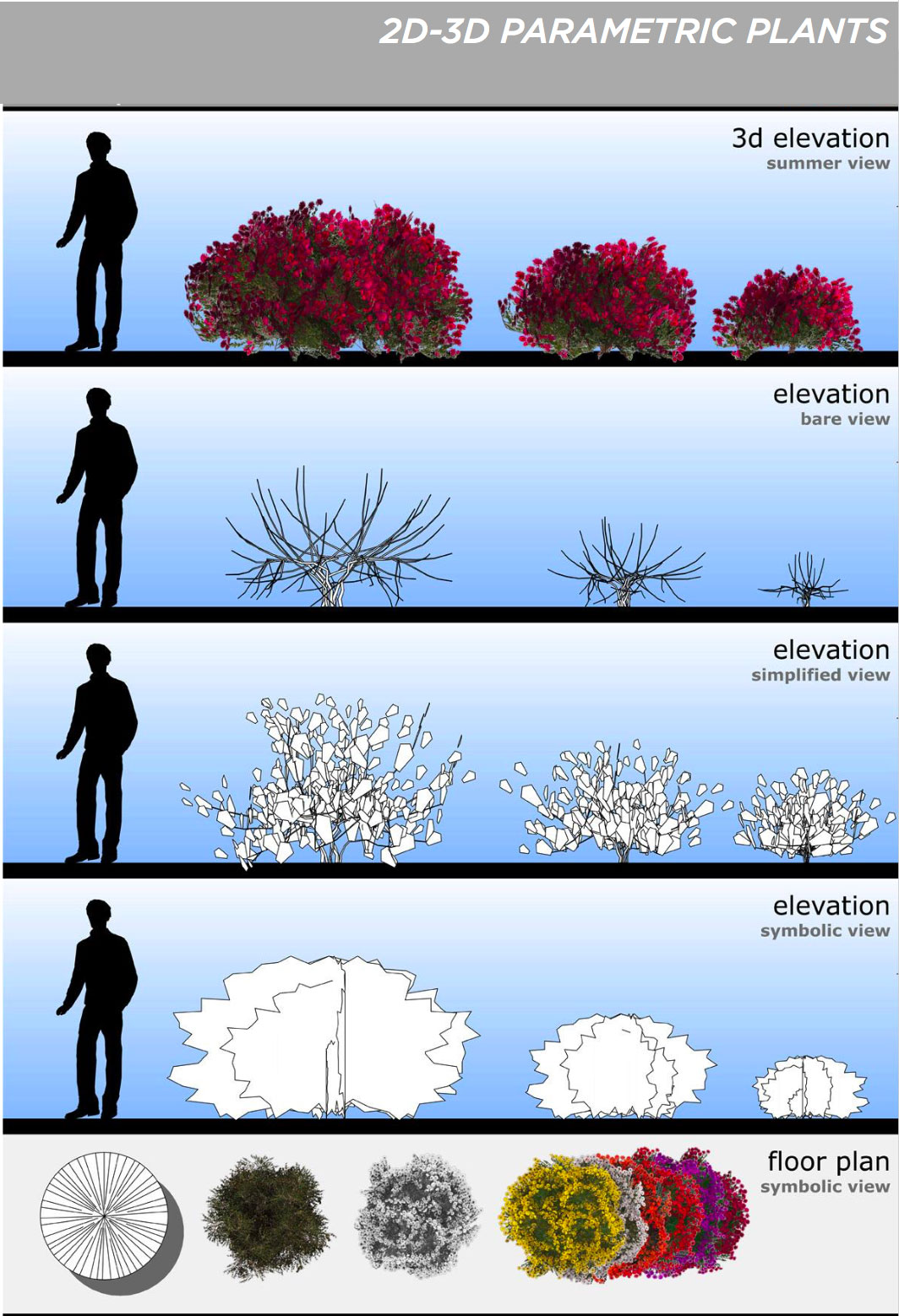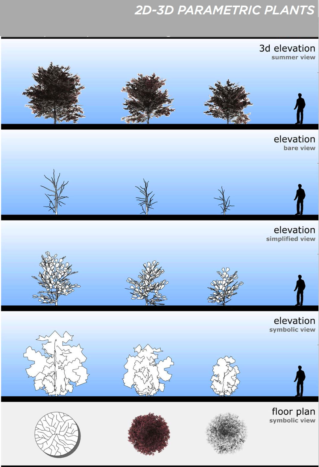 Option available:- Real growing factor- Symbolic view in elevation - 2d symbol shadow- 2d realistic symbol- 3d detail level- Wind option in movies- Season (no evergreen)