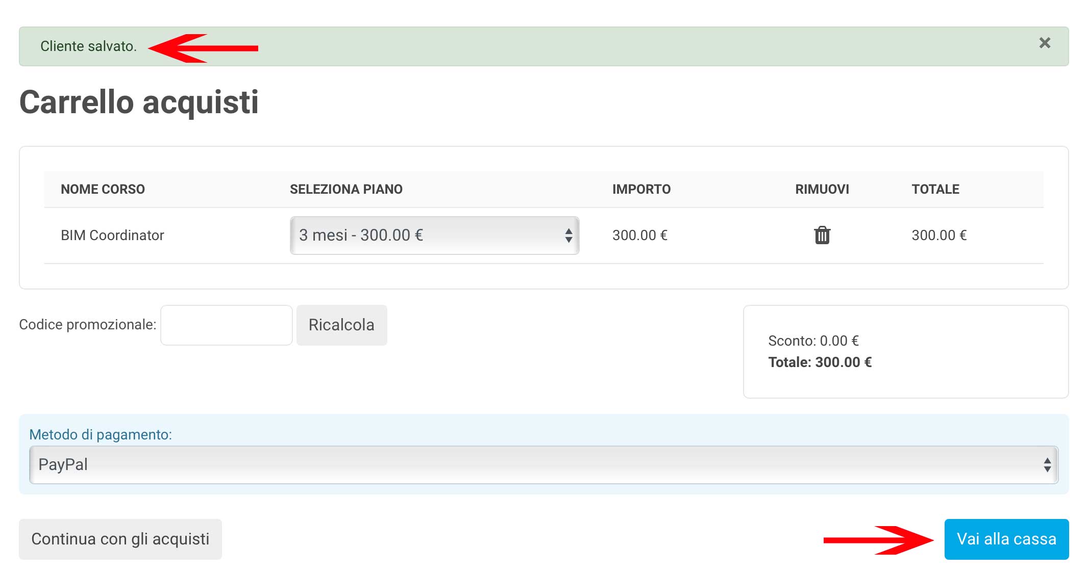 5- Vi si aprirà di nuovo la finestra del carrello acquisti dove, in alto, ci sarà il messaggio "Cliente salvato". Avrete così effettuato la registrazione.
