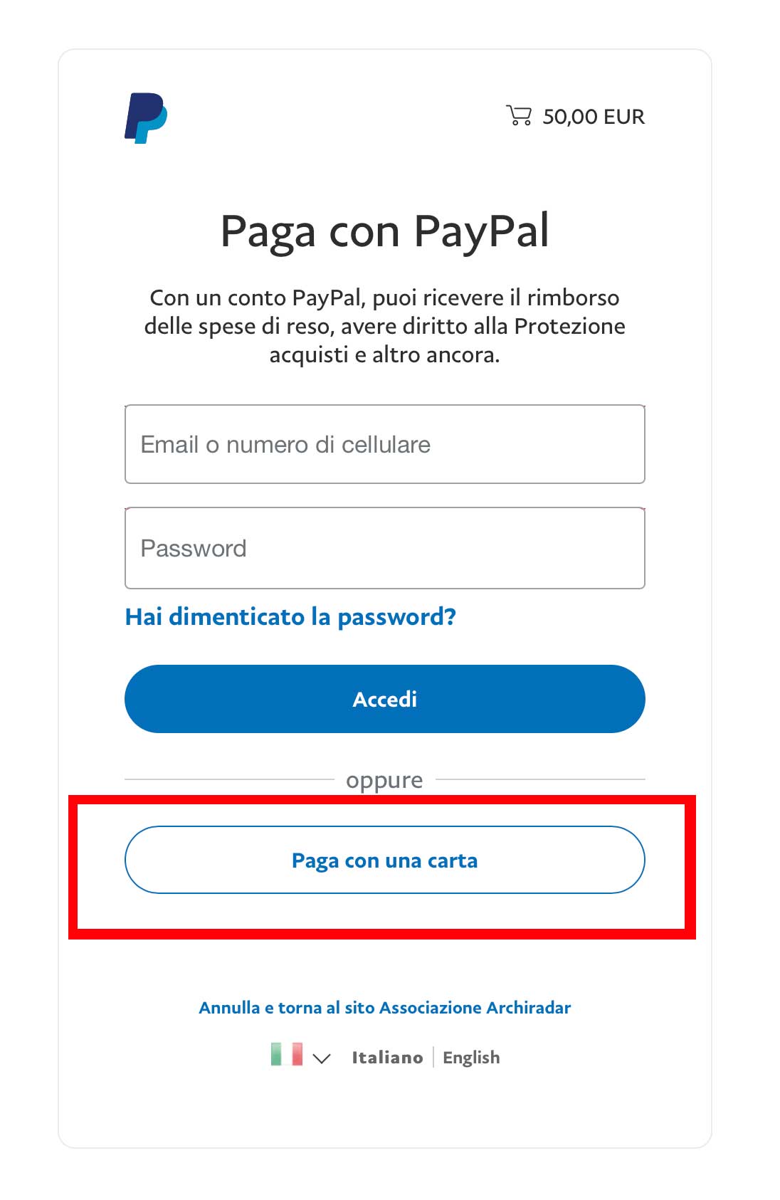 7- Terminata l'attesa si aprirà la finestra del sito PayPal in cui potrete, se avete un account lì sopra, inserire i vostri dati. Se NON avete un account Paypal potete cliccare sul pulsante "Paga con una carta" che vi permetterà di inserire i dati della vostra carta di credito per procedere all'acquisto del corso: